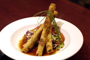 spiced fresh salmon, rolled in spinach and vegetables, fried in a crisp wrapper and served with hot sweet chili sauce. 9
